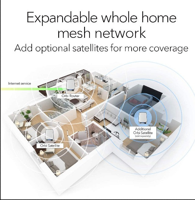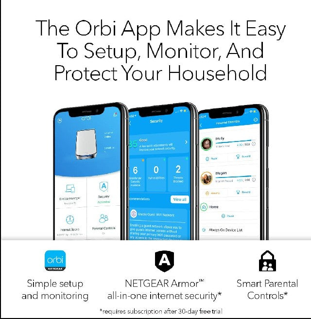 • Sets up in minutes with the Orbi App; easily manage WiFi settings, test internet speed, and monitor data usage.