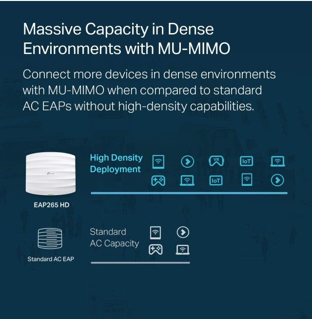 • Superior Speeds with MU-MIMO Designed with the latest 802.11ac Wave 2 MU-MIMO technology, the EAP265 HD easily delivers dual-band Wi-Fi speeds of up to 1750 Mbps to multiple devices at the same time.