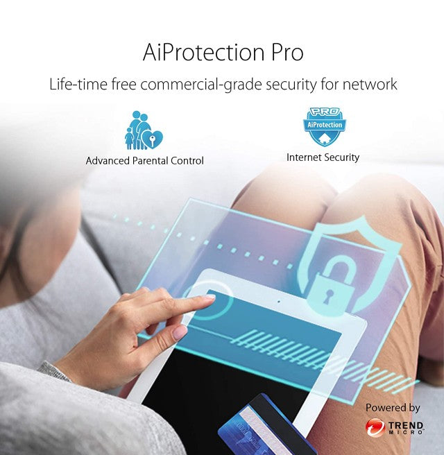 - Commercial grade home network security Lifetime free ASUS AiProtection Pro, powered by Trend Microâ„¢, with WPA3 and advanced Parental Controls to protect your home.