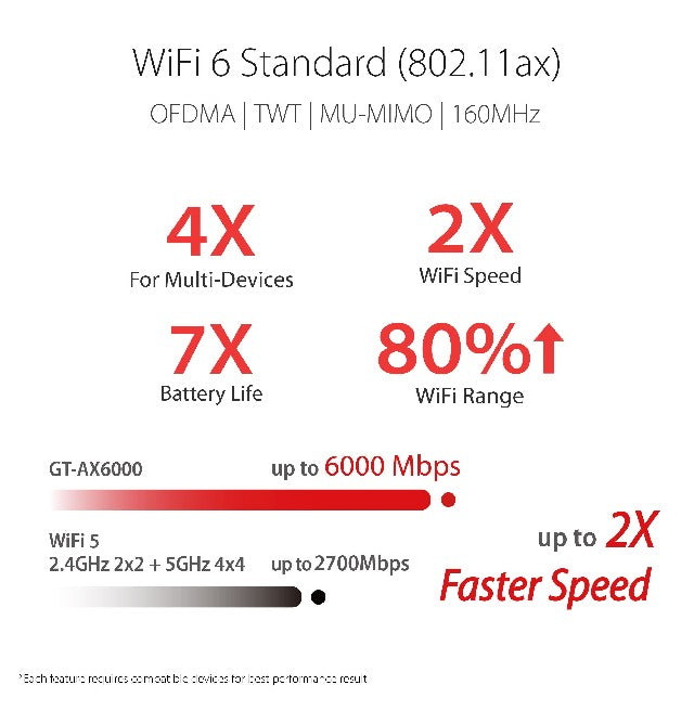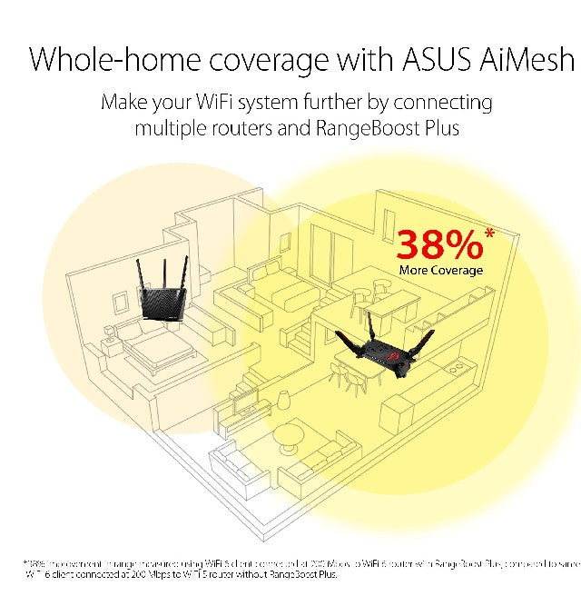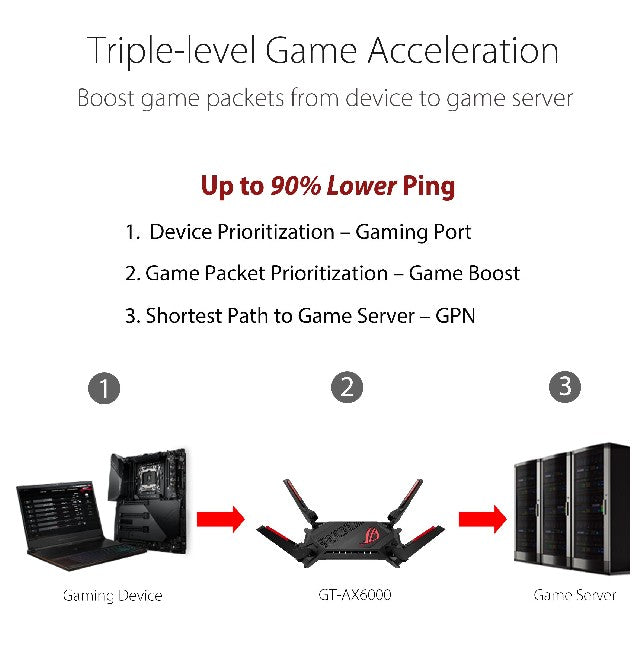 • The ROG Rapture GT-AX6000 also features three levels of game acceleration by prioritizing gaming devices and game related data packets and automatically finding the shortest path to your favorite game server with select titles.