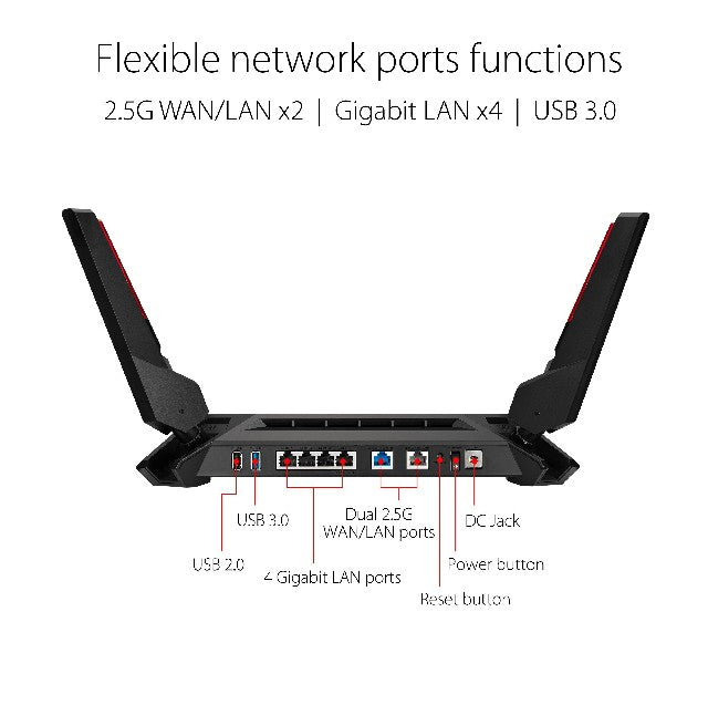 • The 2.5G WAN and 2.5G LAN ports allow you to take full advantage of multi-Gig internet services and high-speed devices such as network attached storage.