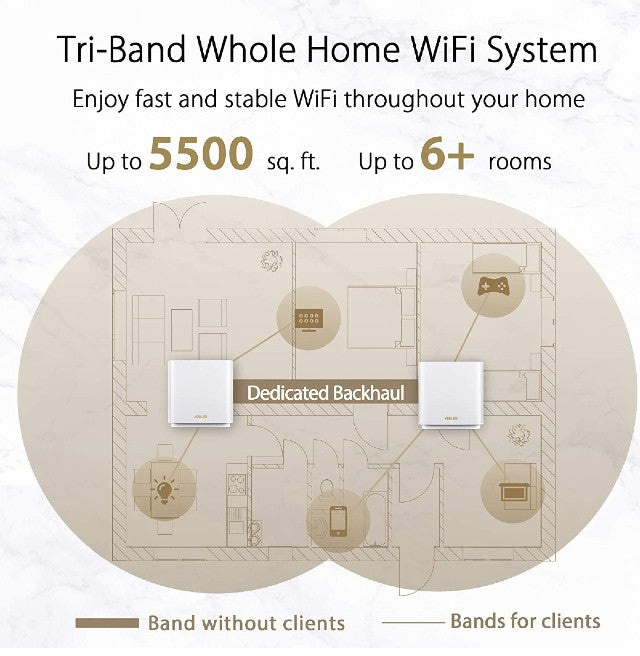 • Banish WiFi Dead Zone—Tri-band mesh WiFi system with unique antenna placement delivers strong WiFi to every corner of your home, providing total wireless speed of 6600Mbps.
