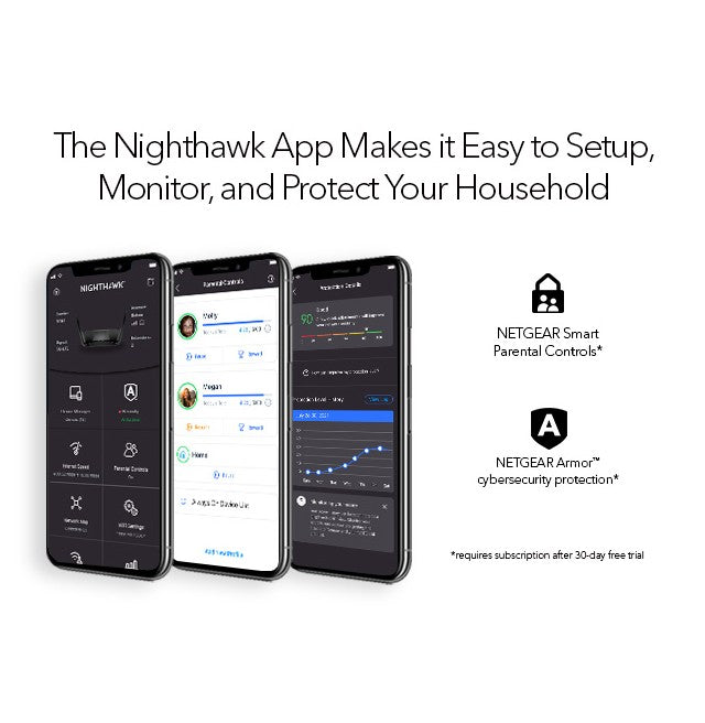 • Sets up in minutes with the Nighthawk app – easily manage WiFi settings at the device and network level, test internet speed and monitor data usage.